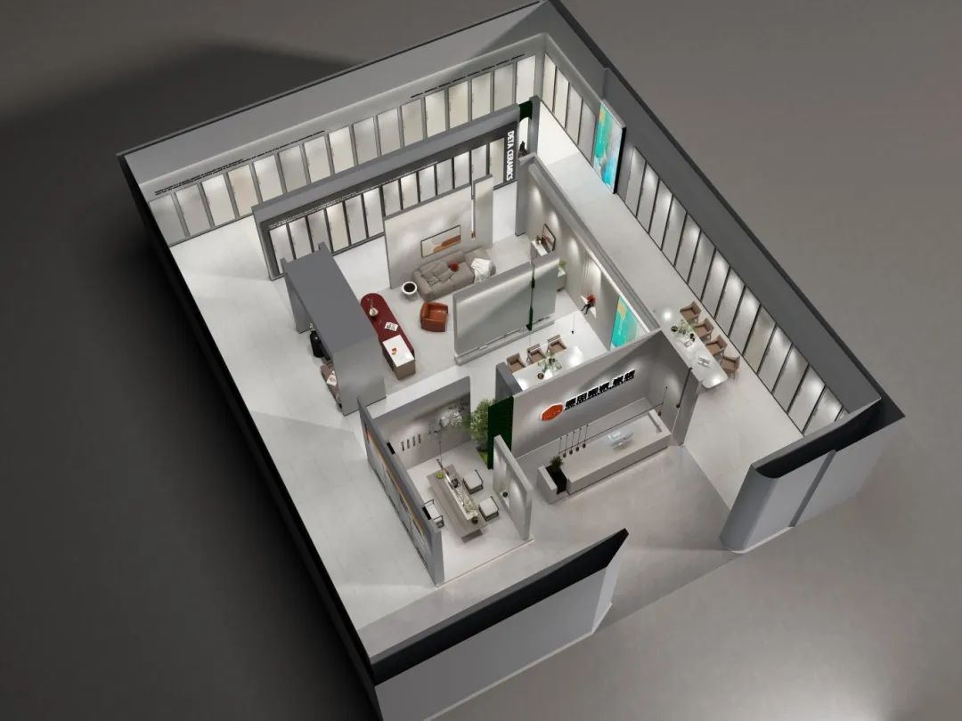 德田陶瓷全新終端SI形象標準,將展廳的動線布局與現代美學手法相結合,在燈光的映襯下,通過明暗對比分割空間,利用空間分隔和材料元素的構型立意,將產品融入到空間的細膩表達中,增強客戶的體驗感。